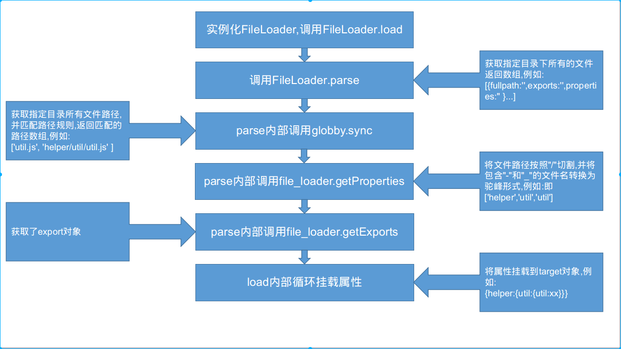 // 是FileLoader主方法 // 该方法将指定目录下的所有文件,按照文件层次组成对象(就是上面提到的target对象) load() { // 执行parse方法,获取指定文件目录下所有文件,返回为数组 // 例 [{fullpath:"",exports:"",properties:"" }] const items = this.parse(); // 引用赋值,target改变后,this.options.target也将改变 const target = this.options.target; for (const item of items) { // 通过reduce函数,将target属性不断传递下去,最后形成以文件层级为键名的对象 // 例 {help1:{util1:{...}}} item.properties.reduce((target, property, index) => { let obj; const properties = item.properties.slice(0, index + 1).join('.'); // 当前属性是否为最后一位,如果是最后一位,则代表当前是文件的路径,而非目录 if (index === item.properties.length - 1) { // 防止属性覆盖,同一个文件夹下文件名不允许重复,所以这里主要是防止覆盖掉target对象原来的属性 if (property in target) { if (!this.options.override) throw new Error( `can't overwrite property '${properties}' from ${ target[property][FULLPATH] } by ${item.fullpath}` ); } obj = item.exports; // 如果当前是文件且exports对象不是简单数据类型 if (obj && !is.primitive(obj)) { obj[FULLPATH] = item.fullpath; // 这里的EXPORTS属性,即是在FileLoader里使用的EXPORTS obj[EXPORTS] = true; } } else { // 当前是目录时,如果target不含该属性,则创建空对象 obj = target[property] || {}; } target[property] = obj; debug('loaded %s', properties); return obj; }, target); } return target; }}