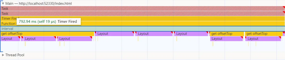 - 主线程阻塞,阻塞时间约为 800ms,阻塞原因为 interval 函数调用过久,原因是获取 offsetTop 造成 layout