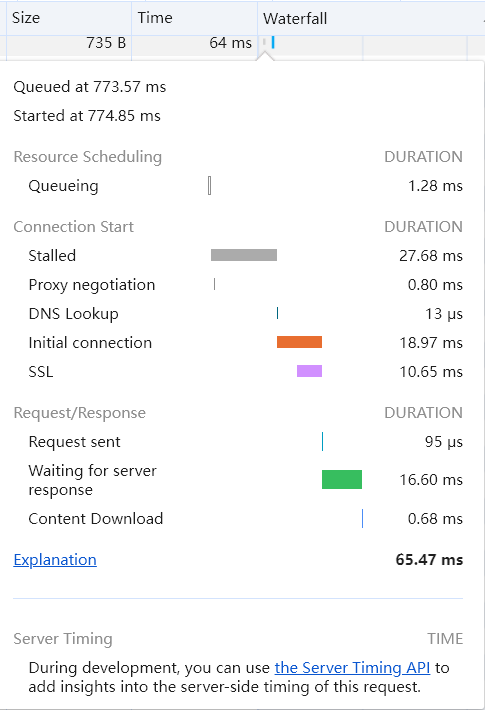 还可以在 Devtools 的 Network 下查看一个请求的耗时细分