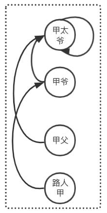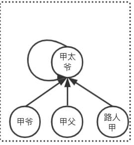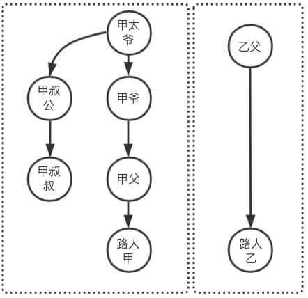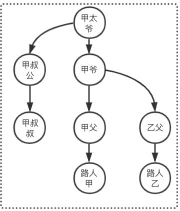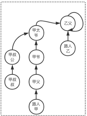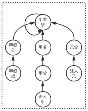 同理查询出路人乙的祖先是乙父,由于 甲太爷 != 乙父,则 路人甲和路人乙不是亲戚
