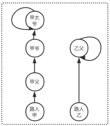 按照上述 Find 步骤 求得 甲太爷 == 甲太爷,则 路人甲和路人乙是亲戚