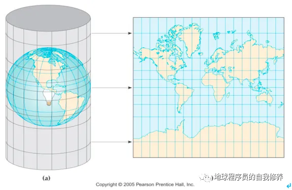 墨卡托投影为正轴等角切圆柱投影,存在如下特点