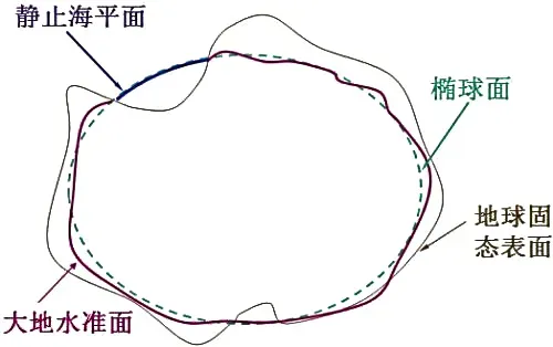 假想海面静止,且延申至大陆,受到重力的影响下,形成一个不平滑过度的,凹凸不平的闭合曲面。它是最拟合地球的参考曲面了,需要注意的是大地水准面不等于海平面
