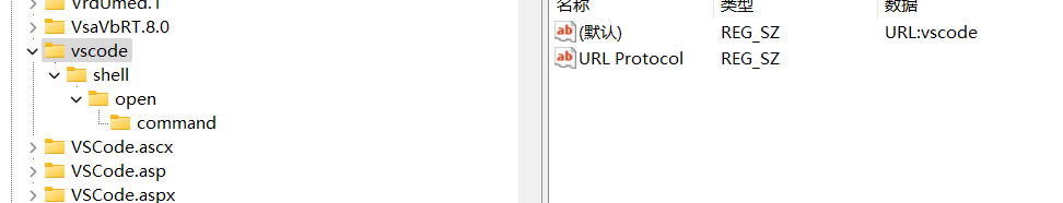 在 HKEY_CLASSES_ROOT 可以找到各个应用的配置,如下所示,是 vscode 的注册表配置,你可以在浏览器使用 vscode:// 来打开该程序