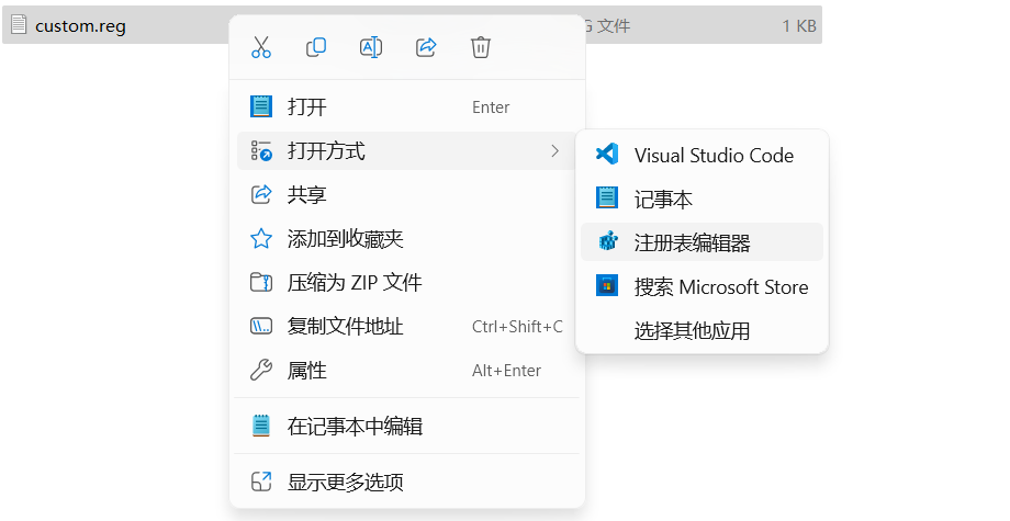 我们可以在 HKEY_CLASSES_ROOT 下创建自定义的协议。首先将我们刚刚在 HKEY_CLASSES_ROOT 内找到 vscode 的协议配置导出,命名为 custom.reg,并用文本编辑打开该文件,在此基础上可以进行修改
